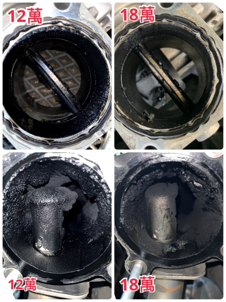 下圖為12萬公里與18萬公里節氣門與後段積碳比較